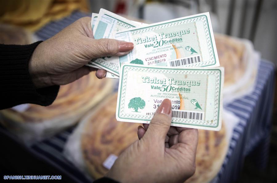 Una persona muestra "vales de créditos" para intercambiar por productos y servicios en el "Club del Trueque"", en la localidad de Bernal, a 18 kilómetros de Buenos Aires, capital de Argentina, el 19 de mayo de 2019. La legendaria práctica del trueque, mediante la cual personas intercambian servicios y productos sin usar dinero, se renueva en Argentina con fines solidarios y de amistad en un contexto desafiante en materia económica. (Xinhua/Martín Zabala)