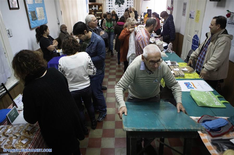 Personas preparan mesas con los productos y servicios a intercambiar en el "Club del Trueque"", en la localidad de Bernal, a 18 kilómetros de Buenos Aires, capital de Argentina, el 19 de mayo de 2019. La legendaria práctica del trueque, mediante la cual personas intercambian servicios y productos sin usar dinero, se renueva en Argentina con fines solidarios y de amistad en un contexto desafiante en materia económica. (Xinhua/Martín Zabala)