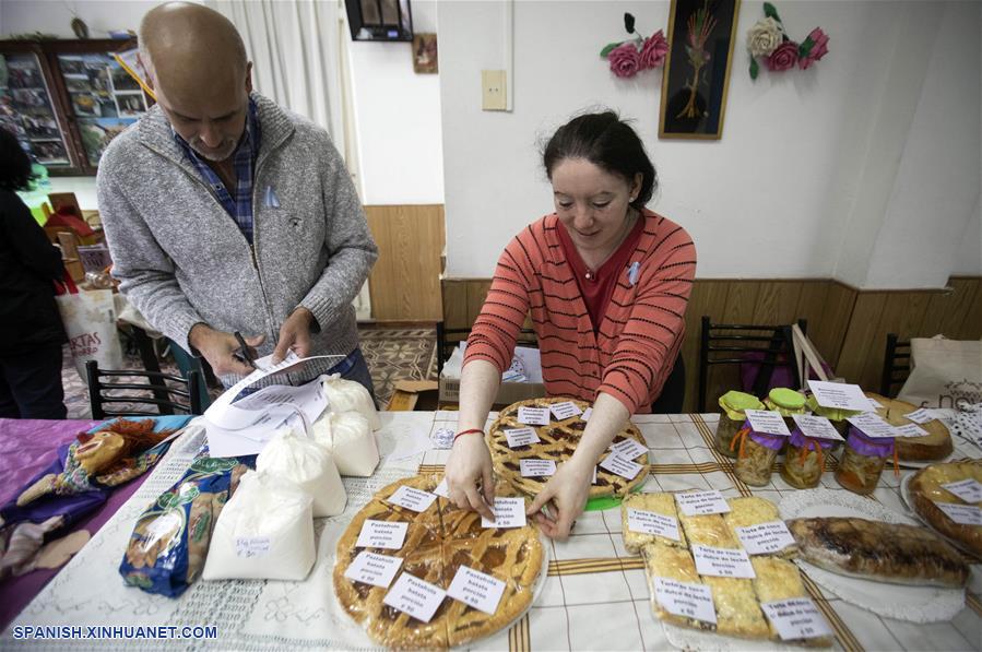 Una mujer acomoda tarjetas sobre porciones de tarta de dulce de batata que llevó al "Club del Trueque", en la localidad de Bernal, a 18 kilómetros de Buenos Aires, capital de Argentina, el 19 de mayo de 2019. La legendaria práctica del trueque, mediante la cual personas intercambian servicios y productos sin usar dinero, se renueva en Argentina con fines solidarios y de amistad en un contexto desafiante en materia económica. (Xinhua/Martín Zabala)