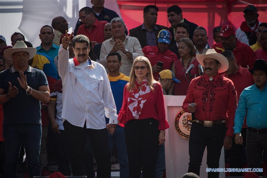 El presidente de Venezuela, Nicolás Maduro (2-i), en compa?ía de su esposa, Cilia Flores (c), saluda al público durante una movilización en las cercanías del Palacio de Miraflores, a un a?o de su reelección, en Caracas, Venezuela, el 20 de mayo de 2019. El presidente de Venezuela, Nicolás Maduro, reiteró el lunes la propuesta para adelantar las elecciones legislativas, así como el llamado al diálogo como solución a la difícil situación que vive el país. (Xinhua/Marcos Salgado)