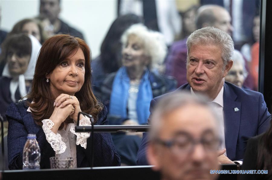 La ex presidenta de Argentina, Cristina Fernández (i), reacciona junto a su abogado Carlos Beraldi (d), durante el juicio oral en el Tribunal Oral Federal 2 (TOF 2), en Buenos Aires, Argentina, el 21 de mayo de 2019. La ex presidenta de Argentina, Cristina Fernández (2007-2015), denunció el martes que enfrenta una "persecución" en su contra en un a?o electoral en el país sudamericano. (Xinhua/Martín Zabala)