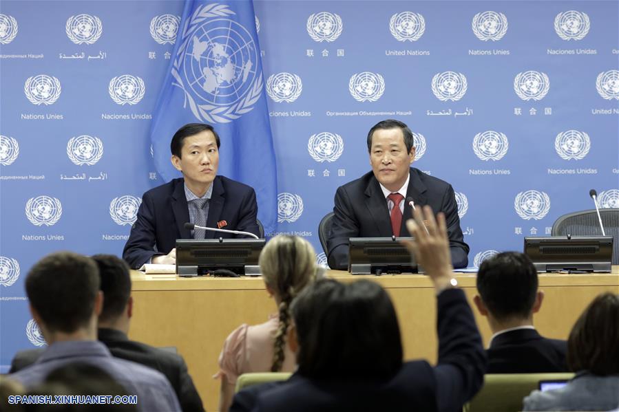Kim Song (d-atrás), el representante permanente de República Popular Democrática de Corea (RPDC) ante la Organización de las Naciones Unidas (ONU), participa durante una conferencia de prensa en la sede de la ONU, en Nueva York, Estados Unidos, el 21 de mayo de 2019. El representante permanente de República Popular Democrática de Corea (RPDC) ante la ONU denunció el martes la incautación de un carguero de su país por parte de Estados Unidos. (Xinhua/Xie E)
