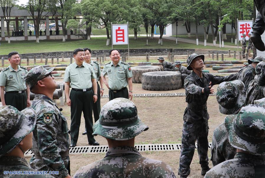El presidente chino, Xi Jinping, también secretario general del Comité Central del Partido Comunista de China y presidente de la Comisión Militar Central, observa una sesión de entrenamiento en el Colegio de Infantería del Ejército Popular de Liberación en la provincia de Jiangxi, en el este de China. Xi inspeccionó el martes el Colegio de Infantería del Ejército Popular de Liberación en la provincia de Jiangxi, en el este de China. (Xinhua/Li Gang)