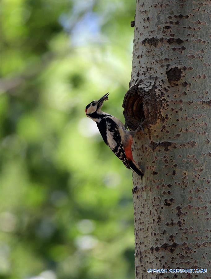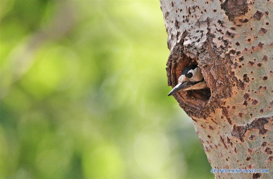 LIAONING, 22 mayo, 2019 (Xinhua) -- Un gran pájaro carpintero manchado sale de su agujero para buscar alimento en un bosque por el Río Hunhe, en Shenyang, provincia de Liaoning, en el noreste de China, el 22 de mayo de 2019. (Xinhua/Yang Qing)