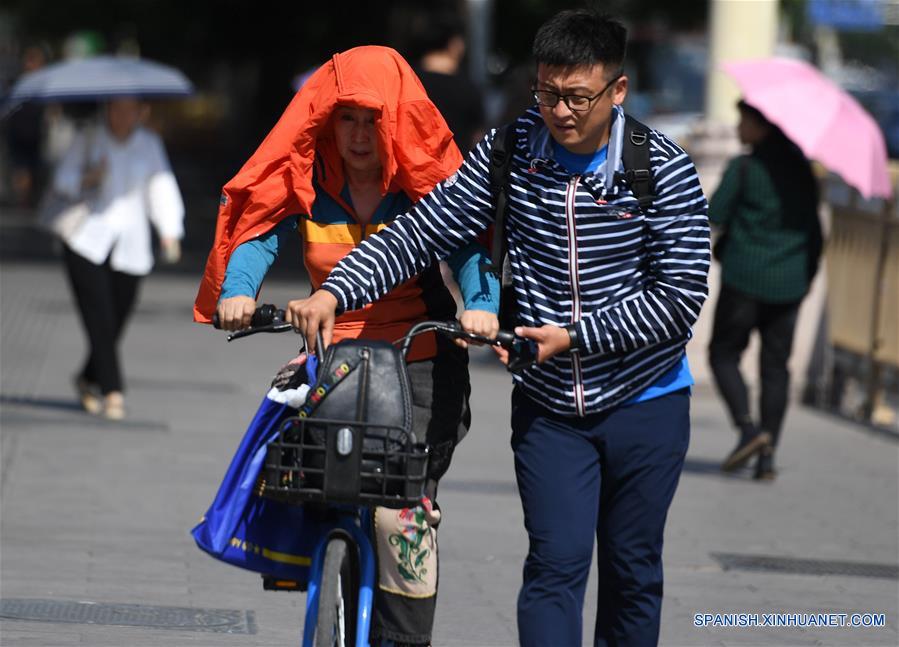 BEIJING, 22 mayo, 2019 (Xinhua) -- Un peatón (i) se coloca una chaqueta sobre la cabeza y hombros como sombra para protegerse del sol, en Beijing, capital de China, el 22 de mayo de 2019. El observatorio de Beijing emitió una alerta amarilla el martes por altas temperaturas durante los próximos cuatro días. La temperatura podría subir a 35 grados centígrados desde el miércoles al sábado, y llegar hasta los 37 grados centígrados el jueves. (Xinhua/Zhang Chenlin)
