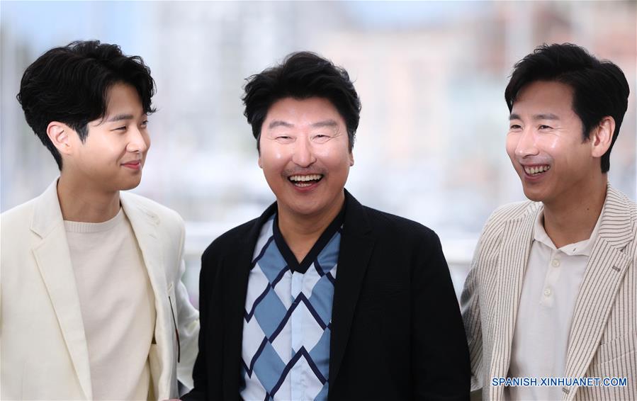 CANNES, 22 mayo, 2019 (Xinhua) -- Los actores Choi Woo-shik (i), Kang-ho Song (c) y Lee Sun-kyun (d) posan en una sesión fotográfica de la película "Parasite" durante la 72 edición del Festival de Cine de Cannes, en Cannes, Francia, el 22 de mayo de 2019. "Parasite" competirá por la Palma de Oro junto a otras 20 películas. (Xinhua/Gao Jing)
