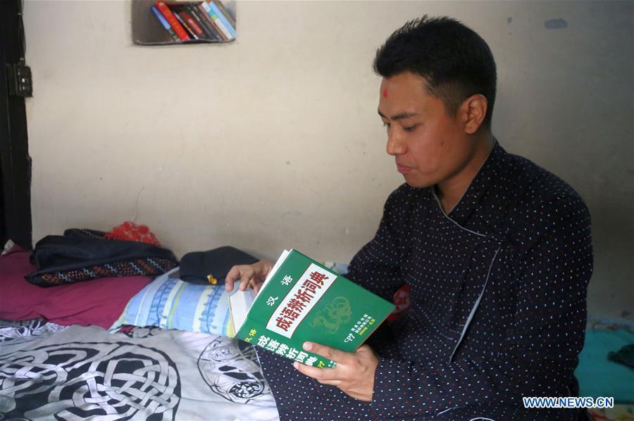 Binaya Hada lee un libro chino en su casa de Bhaktapur, Nepal, el 15 de mayo del 2019. Binaya es un joven nepalí de 34 a?os de edad, cuyo trabajo fue seleccionado para una exposición fotográfica sobre la civilización asiática. Graduado de la Universidad de Lengua y Cultura de Beijing, ahora se dedica a estudiar la cultura china y popularizar el idioma chino entre sus compatriotas. (Foto: Sunil Sharma/ Xinhua)
