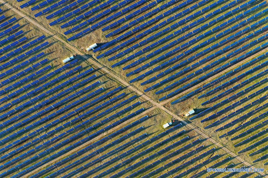 SHANXI, 23 mayo, 2019 (Xinhua) -- Vista aérea de una central fotovoltaica (FV), en la villa de Tujing del municipio de Duzhuang en la ciudad de Datong, provincia de Shanxi, en el norte de China el 23 de mayo de 2019. Datong ha desarrollado vigorosamente la construcción de centrales fotovoltaicas sobre monta?as áridas, tierra salina-alcalina y áreas de hundimiento de la minería de carbón. Un total de 122 centrales fotovoltaicas a nivel de aldea han comenzado operaciones, ayudando a aumentar los ingresos de los hogares afectados por la pobreza en más de 400 villas en Datong. (Xinhua/Cao Yang)
