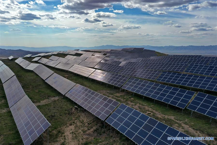 SHANXI, 23 mayo, 2019 (Xinhua) -- Imagen del 22 de mayo de 2019 de una vista aérea de una central fotovoltaica (FV), en el distrito de Tianzhen de la ciudad de Datong, provincia de Shanxi, en el norte de China. Datong ha desarrollado vigorosamente la construcción de centrales fotovoltaicas sobre monta?as áridas, tierra salina-alcalina y áreas de hundimiento de la minería de carbón. Un total de 122 centrales fotovoltaicas a nivel de aldea han comenzado operaciones, ayudando a aumentar los ingresos de los hogares afectados por la pobreza en más de 400 villas en Datong. (Xinhua/Cao Yang)