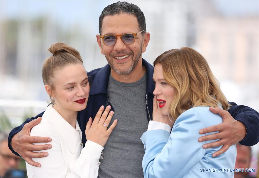 CANNES, 23 mayo, 2019 (Xinhua) -- El actor Roschdy Zem (c), junto a las actrices Lea Seydoux (d) y Sara Forestier (i), posan en una sesión fotográfica de la película "Oh Mercy! (Roubaix, une lumiere)" durante la 72 edición del Festival de Cine de Cannes, en Cannes, Francia, el 23 de mayo de 2019. "Oh Mercy! (Roubaix, une Lumiere)" competirá por la Palma de Oro junto a otras 20 películas. (Xinhua/Gao Jing)