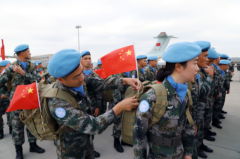 Un soldado de mantenimiento de la paz ajusta la bandera china adherida a la mochila militar de otro soldado cuando se preparan para abordar el avión, 22 de mayo de 2019. [Foto de Sun Shuai para chinadaily.com.cn]