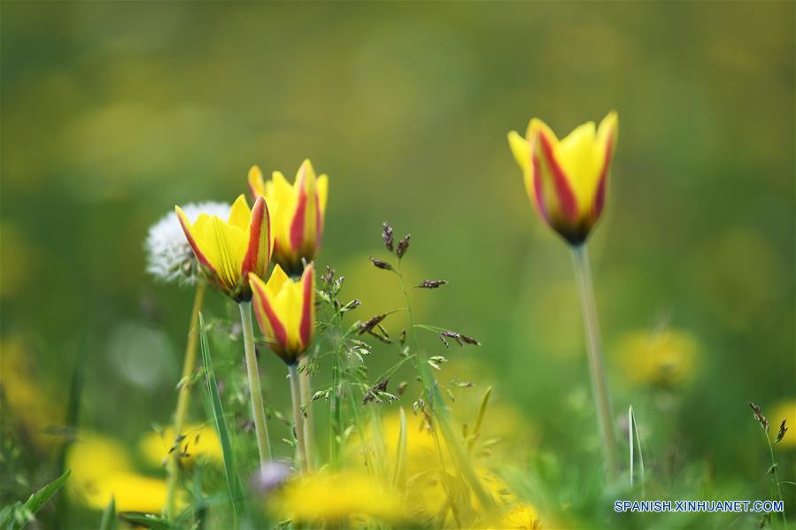 Imagen del 24 de mayo de 2019 de flores floreciendo en el punto escénico de la pradera de Narat, en la Prefectura Autónoma kazaja de Ili, en la Región Autónoma Uygur de Xinjiang, en el noroeste de China. Los turistas están llegando a la pradera de Narat para disfrutar su espléndido paisaje mientras el clima se está calentando. El punto escénico de la pradera de Narat recibió a más de 50.000 turistas del 1 de abril al 24 de mayo.