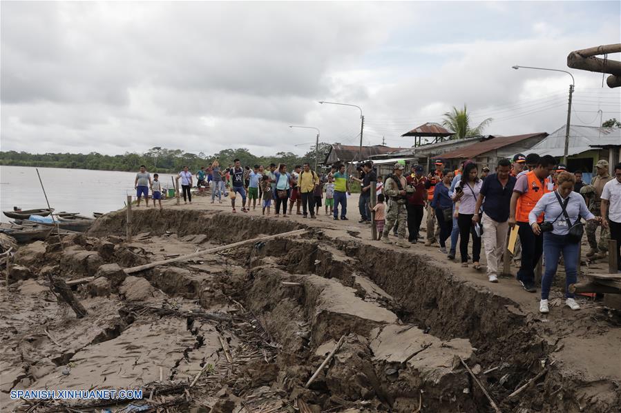 Personas caminan por un área afectada del puerto de Santa Gema tras un sismo, en las afueras de Yurimaguas, Perú, el 26 de mayo de 2019. Una persona muerta y otras 11 heridas en Perú es el saldo preliminar del terremoto de magnitud 7,5 en la escala de Richter registrado la madrugada del domingo en el norte del país andino, confirmó el coordinador del Centro de Operaciones de Emergencia Nacional (COEN), Ricardo Seijas. (Xinhua/Guadalupe Pardo/Pool)