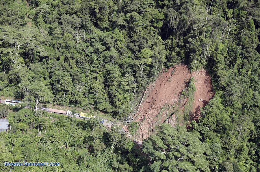 Vista aérea de un deslizamiento de tierra luego de un sismo, en Yurimaguas, Perú, el 26 de mayo de 2019. Una persona muerta y otras 11 heridas en Perú fue el saldo preliminar que dejó el terremoto de magnitud 7,5 en la escala de Richter registrado la madrugada de este domingo en el norte del país andino, confirmó el coordinador del Centro de Operaciones de Emergencia Nacional (COEN), Ricardo Seijas. (Xinhua/Guadalupe Pardo/Pool)
