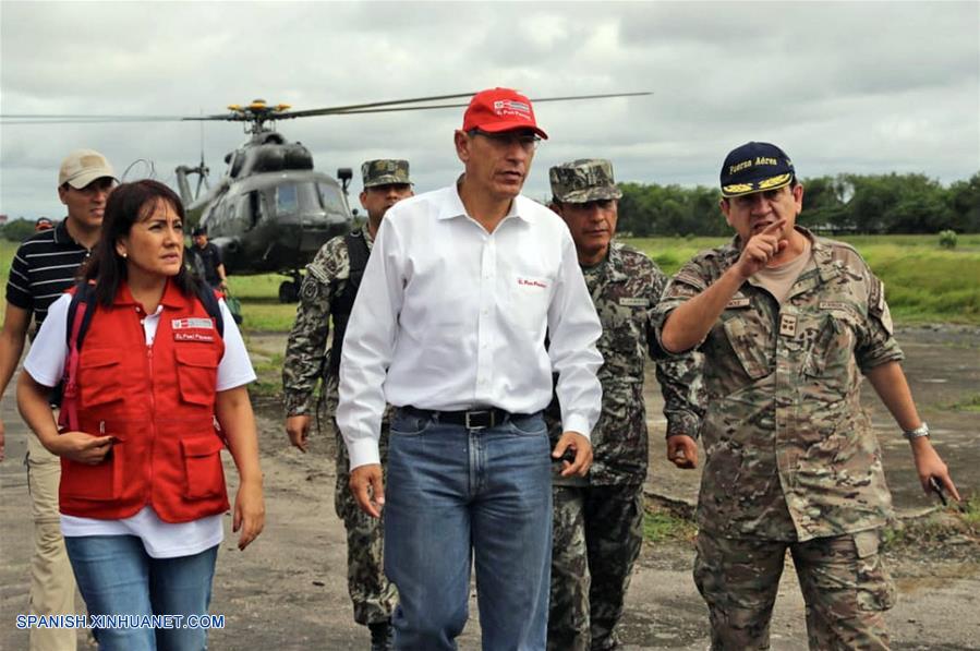 Imagen cedida por la Agencia Peruana de Noticias Andina, del presidente Martín Vizcarra (c), realizando un recorrido por las zonas afectadas luego de un sismo, en Yurimaguas, Perú, el 26 de mayo de 2019. Una persona muerta y otras 11 heridas en Perú fue el saldo preliminar que dejó el terremoto de magnitud 7,5 en la escala de Richter registrado la madrugada de este domingo en el norte del país andino, confirmó el coordinador del Centro de Operaciones de Emergencia Nacional (COEN), Ricardo Seijas. (Xinhua/ANDINA)