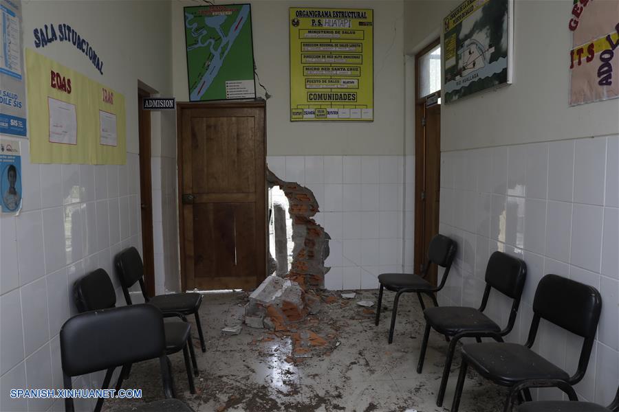 Vista del interior de una sala de espera afectada tras un sismo, en Huatapi, en las afueras de Yurimaguas, Perú, el 26 de mayo de 2019. Una persona muerta y otras 11 heridas en Perú es el saldo preliminar del terremoto de magnitud 7,5 en la escala de Richter registrado la madrugada del domingo en el norte del país andino, confirmó el coordinador del Centro de Operaciones de Emergencia Nacional (COEN), Ricardo Seijas. (Xinhua/Guadalupe Pardo/Pool)