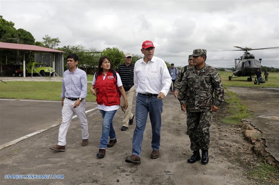 El presidente peruano, Martín Vizcarra (2-d), llega para realiza un recorrido en las zona afectadas luego de un sismo, en Yurimaguas, Perú, el 26 de mayo de 2019. Una persona muerta y otras 11 heridas en Perú fue el saldo preliminar que dejó el terremoto de magnitud 7,5 en la escala de Richter registrado la madrugada del domingo en el norte del país andino, confirmó el coordinador del Centro de Operaciones de Emergencia Nacional (COEN), Ricardo Seijas. (Xinhua/Guadalupe Pardo/Pool)