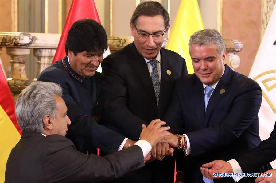 (De izq. a der.) Los presidentes de Ecuador, Lenín Moreno, de Bolivia, Evo Morales, de Perú, Martín Vizcarra, y de Colombia, Iván Duque, participan en la XIX Cumbre Presidencial de la Comunidad Andina de Naciones (CAN) y el 45 Consejo de Ministros de Relaciones Exteriores de la CAN, en el marco de los 50 a?os del grupo regional, en Lima, Perú, el 26 de mayo de 2019. (Xinhua/Mariana Bazo)
