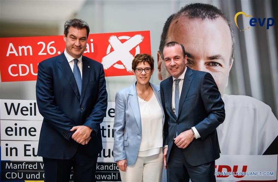 Manfred Weber (d), líder del Partido Popular Europeo (PPE), Annegret Kramp-Karrenbauer (c), líder de la Unión Cristianodemócrata (CDU, por sus siglas en inglés), y Markus Soeder (i), líder de la Unión Socialcristiana (CSU, por sus siglas en inglés), posan para fotografías después de una conferencia de prensa en la sede de la CDU, en Berlín, capital de Alemania, el 26 de mayo de 2019. El bloque conservador CDU/CSU de la canciller Angela Merkel, aseguró 28 por ciento de los votos. Aunque mantuvo la mayor cuota, la unión política perdió cerca del ocho por ciento de los votos en comparación con hace cinco a?os. (Xinhua/Kevin Voigt)