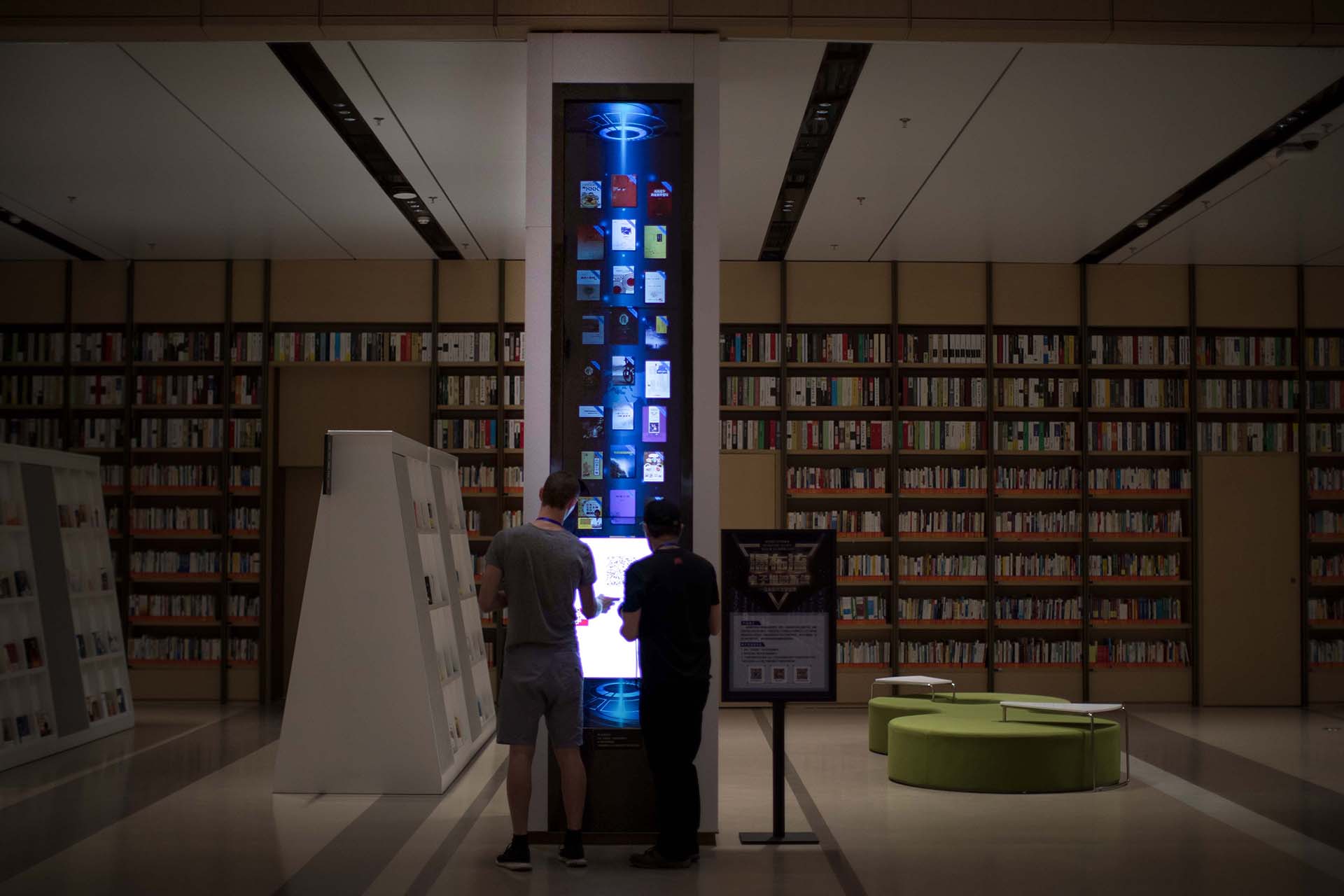 Pantalla inteligente en la Biblioteca de Amistad China-Singapur. Al tocar la pantalla, los lectores pueden obtener información importante de los libros que necesitan. (Pueblo en Línea, por Tanja Herko)
