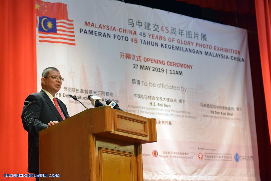 El ministro de Relaciones Exteriores de Malasia, Saifuddin Abdullah pronuncia un discurso durante la ceremonia de apertura de una exposición fotográfica para conmemorar los 45 a?os de relaciones diplomáticas entre China y Malasia en Kuala Lumpur, Malasia, el 27 de mayo de 2019. La exposición fotográfica comenzó el lunes. Organizada por la Cámara de Comercio Malasia-China, la exposición denominada "Exposición Fotográfica 45 A?os de Gloria", presenta 120 fotografías que cubren los intercambios y el desarrollo en políticas, sociedad, economía y comercio, educación, deportes y otros campos en ambos países. (Xinhua/Chong Voon Chung)