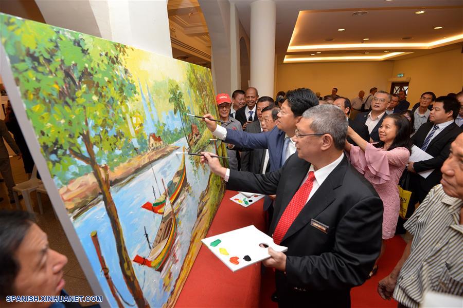 El ministro de Relaciones Exteriores de Malasia, Saifuddin Abdullah y el embajador de China en Malasia, Bai Tian pintan durante una exposición fotográfica para conmemorar los 45 a?os de relaciones diplomáticas entre China y Malasia en Kuala Lumpur, Malasia, el 27 de mayo de 2019. La exposición fotográfica comenzó el lunes. Organizada por la Cámara de Comercio Malasia-China, la exposición denominada "Exposición Fotográfica 45 A?os de Gloria", presenta 120 fotografías que cubren los intercambios y el desarrollo en políticas, sociedad, economía y comercio, educación, deportes y otros campos en ambos países. (Xinhua/Chong Voon Chung)