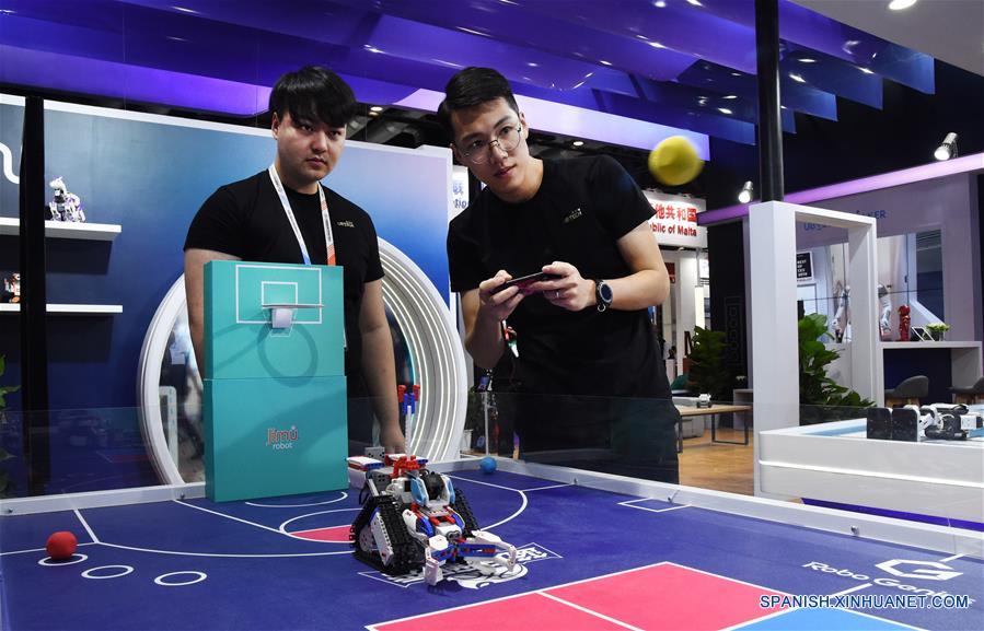 BEIJING, 28 mayo, 2019 (Xinhua) -- Personas interactúan con un robot inteligente educativo de bloques durante la Feria Internacional de China para el Comercio de Servicios de 2019 (CIFTIS, por sus siglas en inglés), en Beijing, capital de China, el 28 de mayo de 2019. La CIFTIS se inauguró el martes en Beijing. (Xinhua/Ren Chao)