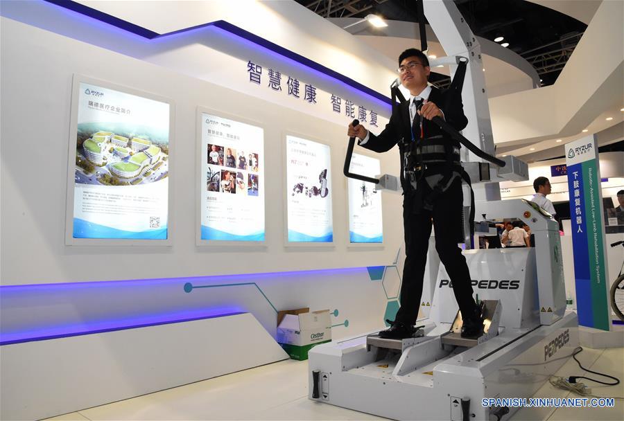 BEIJING, 28 mayo, 2019 (Xinhua) -- Un hombre prueba un robot de rehabilitación de piernas durante la Feria Internacional de China para el Comercio de Servicios de 2019 (CIFTIS, por sus siglas en inglés), en Beijing, capital de China, el 28 de mayo de 2019. La CIFTIS se inauguró el martes en Beijing. (Xinhua/Ren Chao)