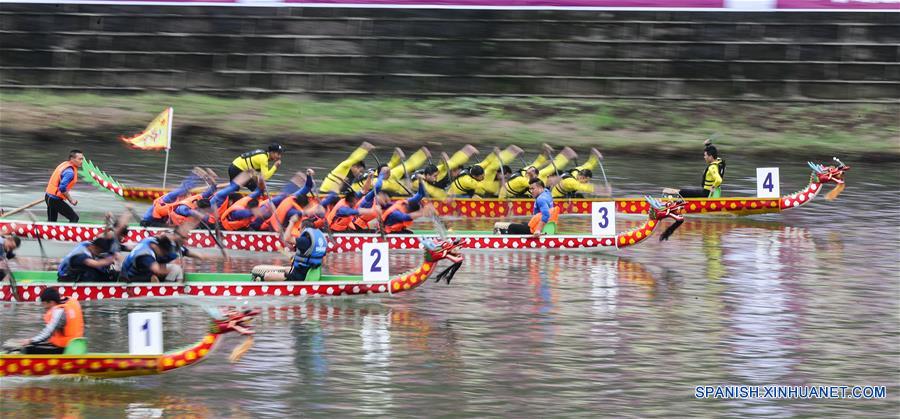 SICHUAN, 29 mayo, 2019 (Xinhua) -- Personas participan en una carrera de botes de dragón en el Río Yujiang, como parte de las costumbres populares tradicionales para celebrar el próximo Festival Duanwu, en el condado de Changning de Yibin, en la provincia de Sichuan, en el suroeste de China, el 29 de mayo de 2019. El Festival Duanwu se celebra tradicionalmente en el quinto día del quinto mes del calendario lunar chino. (Xinhua/Zhuang Geer)