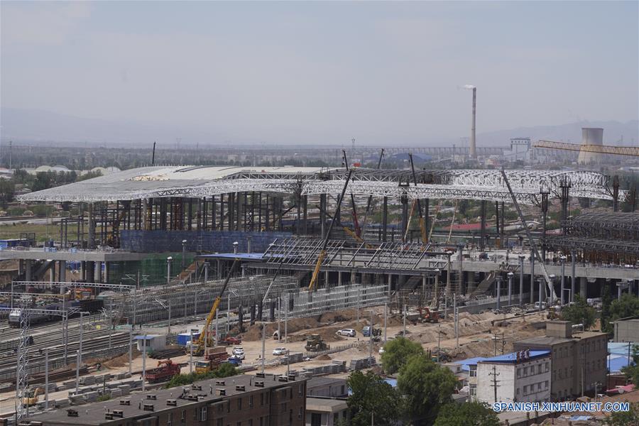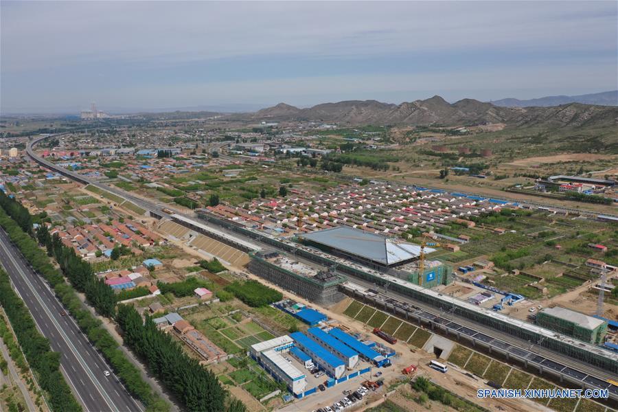HEBEI, 30 mayo, 2019 (Xinhua) -- Vista del sitio de construcción de la Estación Zhangjiakou del ferrocarril de alta velocidad Beijing-Zhangjiakou, en la ciudad de Zhangjiakou, en la provincia de Hebei, en el norte de China, el 30 de mayo de 2019. La estructura principal de la Estación Zhangjiakou ha sido básicamente completada. (Xinhua/Xing Guangli)