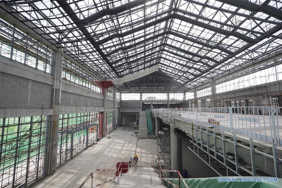 HEBEI, 30 mayo, 2019 (Xinhua) -- Constructores laboran en la Estación Xuanhua Norte del ferrocarril de alta velocidad Beijing-Zhangjiakou, en el distrito de Xuanhua de la ciudad de Zhangjiakou, en la provincia de Hebei, en el norte de China, el 30 de mayo de 2019. El trabajo principal de construcción de la Estación Xuanhua ha terminado y el trabajo de decoración se encuentra en proceso. (Xinhua/Xing Guangli)