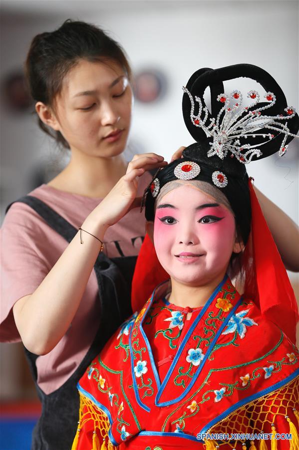 SHANDONG, 30 mayo, 2019 (Xinhua) -- Una maestra arregla los accesorios para la cabeza de una estudiante en la Escuela Experimental Tongji, en Qingdao, provincia de Shandong, en el este de China, el 30 de mayo de 2019. La Escuela Experimental Tongji integra la Opera de Pekín dentro de sus cursos desde septiembre de 2018, con el objetivo de heredar la cultura tradicional china. (Xinhua/Liang Xiaopeng)