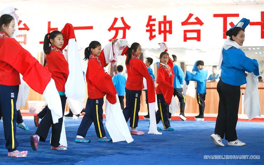 SHANDONG, 30 mayo, 2019 (Xinhua) -- Estudiantes aprenden la Opera de Pekín bajo la guía de una maestra en la Escuela Experimental Tongji, en Qingdao, provincia de Shandong, en el este de China, el 30 de mayo de 2019. La Escuela Experimental Tongji integra la Opera de Pekín dentro de sus cursos desde septiembre de 2018, con el objetivo de heredar la cultura tradicional china. (Xinhua/Liang Xiaopeng)