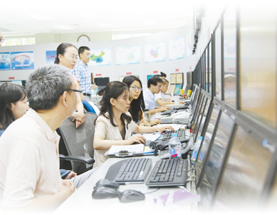 Los miembros del personal de la Estación Meteorológica Central siguen el desarrollo de un tifón. (Foto provista por la Estación Meteorológica Central)