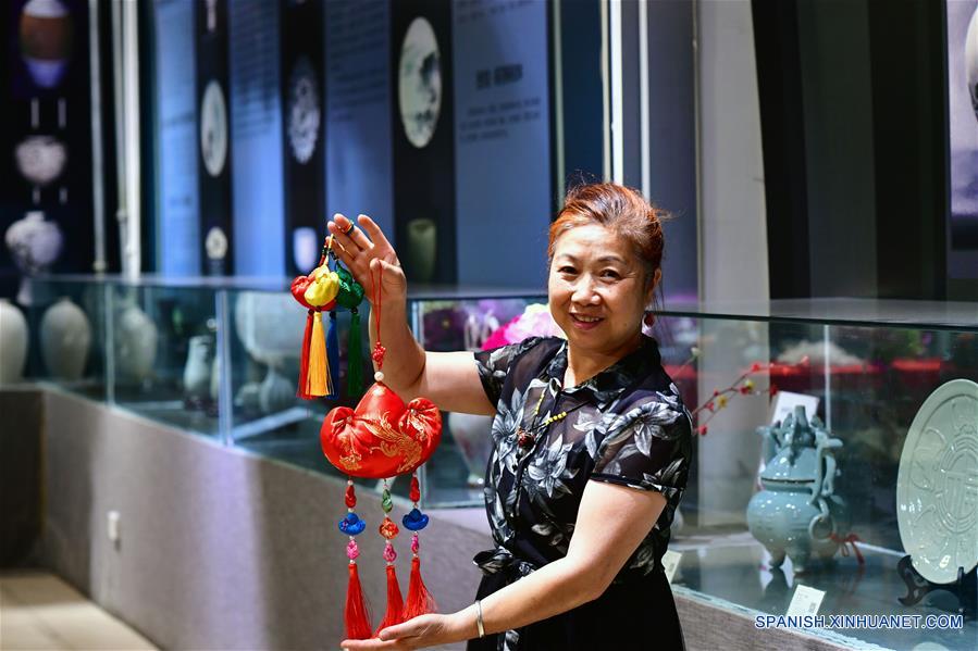 HENAN, 3 junio, 2019 (Xinhua) -- Imagen del 2 de junio de 2019 de Lu Ailing, mostrando almohadillas perfumadas elaboradas por ella, en la Sala de Exposiciones de Patrimonio Cultural Inmaterial de Zhengzhou, en Zhengzhou, capital de la provincia de Henan, en el centro de China. Las almohadillas perfumadas es una artesanía de bordado tradicional en China. Lu Ailing, de 63 a?os de edad, quien nació en una familia de fabricantes de almohadillas perfumadas, es una heredera del patrimonio cultural inmaterial de almohadillas perfumadas en Zhengzhou. Al heredar las habilidades de elaboración de almohadillas perfumadas de su abuela, Lu también pone mucha atención a la innovación de sus modelos, creando una gran variedad de adornos de almohadillas perfumadas y pendientes. Ella cree que el secreto nuclear de las almohadillas es su fragancia. Después de a?os de experiencia buscando en las tiendas de medicina tradicional china, Lu Ailing ha creado su receta única. El deseo más grande de Lu Ailing es ver la artesanía siendo heredada de generación a generación. "Me da gusto observar a tantas personas que aman las almohadillas perfumadas y desean aprender como elaborarlas", dijo Lu. (Xinhua/Feng Dapeng)