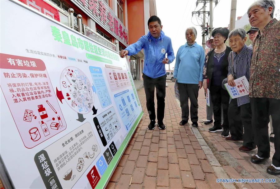 HEBEI, 4 junio, 2019 (Xinhua) -- Un voluntario ejemplifica el conocimiento de la clasificación de residuos a los residentes, en Qinhuangdao, provincia de Hebei, en el norte de China, el 4 de junio de 2019. Diversas actividades se llevan a cabo en todo el país para elevar la conciencia de las personas sobre la clasificación de la basura y ayudarles a desarrollar el hábito de la clasificación de residuos. (Xinhua/Cao Jianxiong)