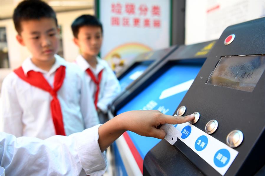 ANHUI, 4 junio, 2019 (Xinhua) -- Alumnos usan instalaciones de clasificación de residuos en la Escuela Primaria Zhaoxia, en Hefei, capital de la provincia de Anhui, en el este de China, el 4 de junio de 2019. Diversas clases actividades temáticas de clasificación de residuos se llevaron a cabo en la Escuela Primaria Zhaoxia para elevar la conciencia de los estudiantes sobre la clasificación de residuos. (Xinhua/Liu Junxi)