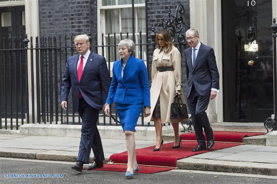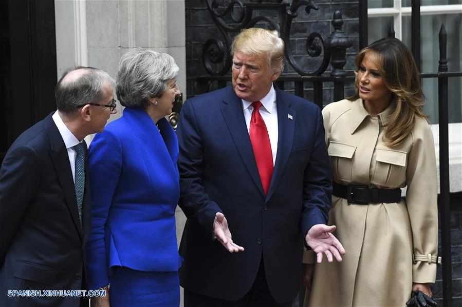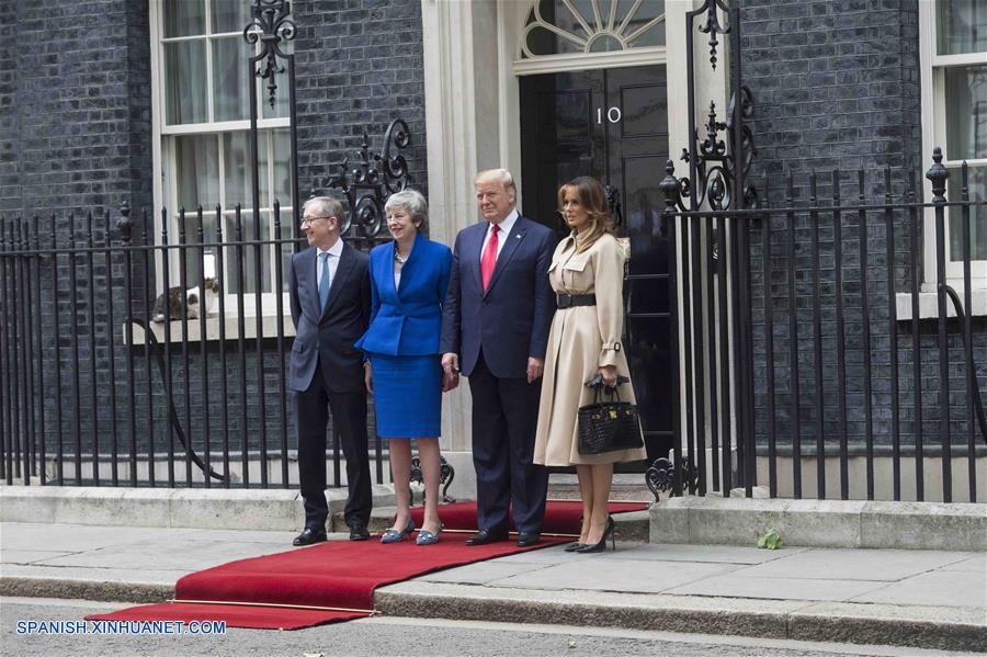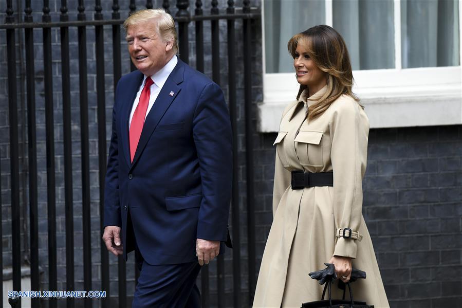 El presidente de Estados Unidos, Donald Trump (i), y su esposa Melania Trump (d), llegan para asistir a una reunión con la primera ministra de Reino Unido, Theresa May y su esposo Philip May, en el número 10 de la calle Downing, en Londres, Reino Unido, el 4 de junio de 2019. La primera ministra británica, Theresa May, dijo el martes que ella y el presidente estadounidense, Donald Trump, desean un tratado de comercio ambicioso después del "brexit". (Xinhua/Alberto Pezzali)