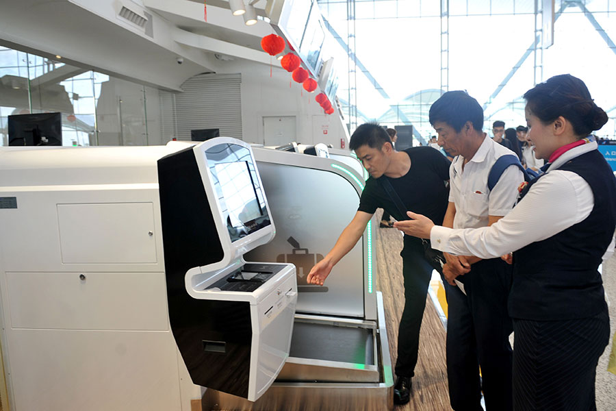Los pasajeros facturan su equipaje de forma automática en el Aeropuerto Internacional Baiyun de Guangzhou. [Foto: Shan Jing/ China Daily]