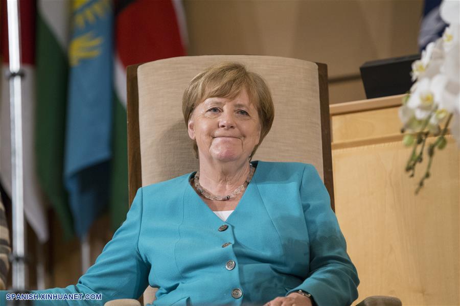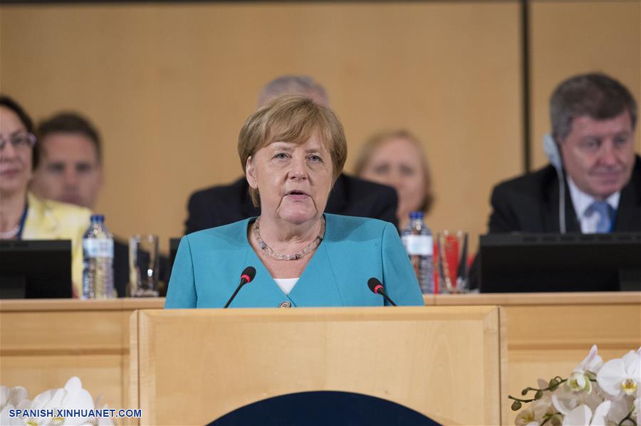 La canciller alemana, Angela Merkel, asiste a la 108 sesión de la Conferencia Internacional del Trabajo, en Ginebra, Suiza, el 11 de junio de 2019. La canciller de Alemania Angela Merkel dijo el martes que el mundo debe trabajar más para mejorar las condiciones laborales y convertir el crecimiento económico en progreso social. (Xinhua/Xu Jinquan)
