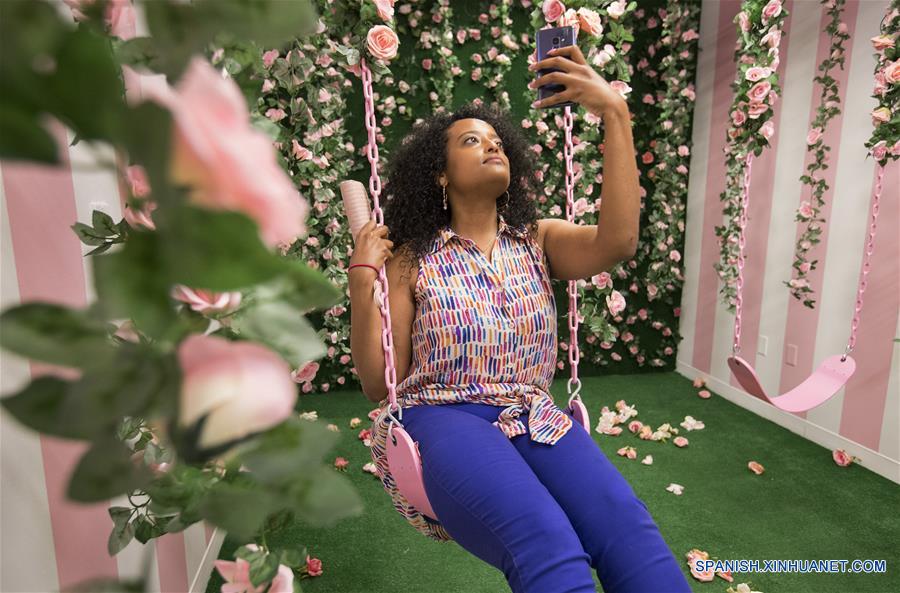 TEXAS, 11 junio, 2019 (Xinhua) -- Imagen del 10 de junio de 2019 de una mujer tomándose fotografías en la Sala de Columpio en la fábrica FOMO, en Houston, estado de Texas, Estados Unidos. La fábrica FOMO invitó a las personas a revivir o reimaginar su infancia con sus cinco sentidos con 17 salas llenas con diferentes elementos inmersivos en la exposición. (Xinhua/Yi-Chin Lee)