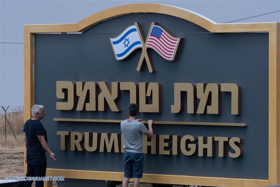 ALTOS DEL GOLAN, 16 junio, 2019 (Xinhua) -- Trabajadores instalan un letrero que dice "Altos Trump", en Altos del Golán, el 16 de junio de 2019. El gobierno de Israel inauguró el domingo un nuevo asentamiento en los anexados Altos del Golán, al que puso el nombre del aliado cercano del país, el presidente estadounidense Donald Trump. (Xinhua/JINI/Ayal Margolin)
