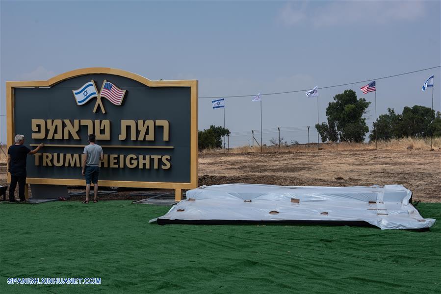 ALTOS DEL GOLAN, 16 junio, 2019 (Xinhua) -- Trabajadores instalan un letrero que dice "Altos Trump", en Altos del Golán, el 16 de junio de 2019. El gobierno de Israel inauguró el domingo un nuevo asentamiento en los anexados Altos del Golán, al que puso el nombre del aliado cercano del país, el presidente estadounidense Donald Trump. (Xinhua/JINI/Ayal Margolin)