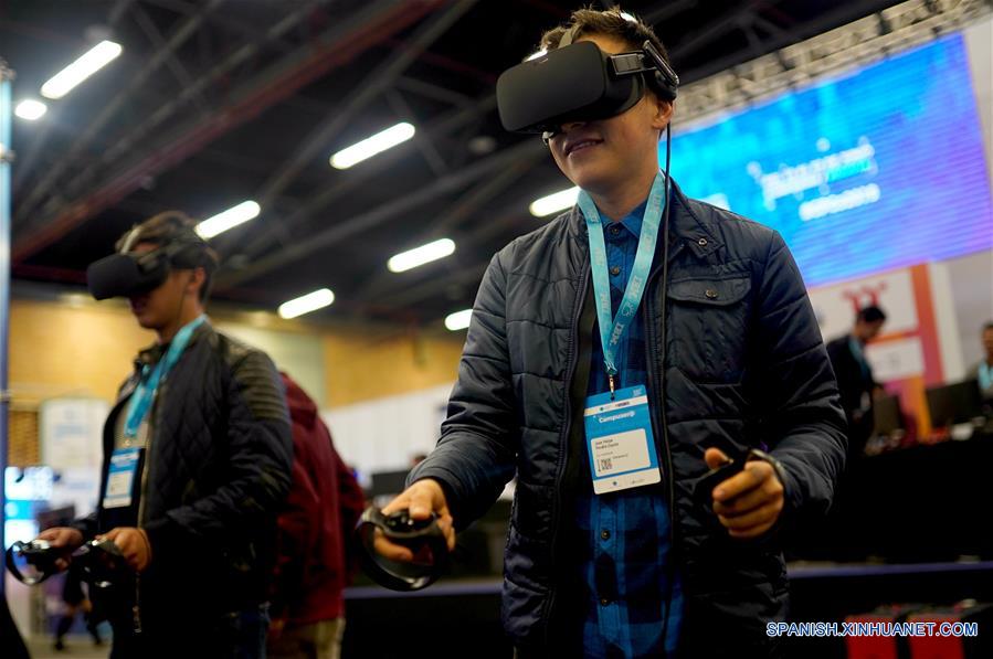 BOGOTA, 18 junio, 2019 (Xinhua) -- Personas juegan con dispositivos de realidad virtual durante la octava versión del festival tecnológico "Campus Party", en el Centro de Eventos Corferias, en la ciudad de Bogotá, capital de Colombia, el 18 de junio de 2019. El "Campus Party" es un festival tecnológico anual que reúne a hackers, desarrolladores, jugadores y geeks de la computadora. De acuerdo con los organizadores, se espera que el evento reciba del 18 al 22 de junio a aproximadamente 5.000 visitantes que participarán en actividades durante 240 horas de contenido distribuido en un los cuatro días. (Xinhua/Jhon Paz)