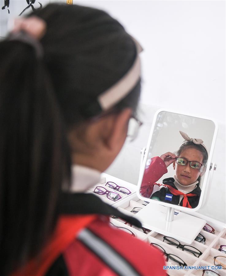 SICHUAN, 19 junio, 2019 (Xinhua) -- Imagen del 17 de junio de 2019, de Zhaxi Wangmo probándose un par de lentes en la Escuela Secundaria de Ruoergai, en el distrito de Ruoergai, en la provincia de Sichuan, en el suroeste de China. El distrito de Ruoergai organizó un examen de la vista para los estudiantes de escuelas primarias y secundarias en abril, y encontró que más de 1.800 estudiantes tenían problemas oculares. Zhaxi Wangmo, de 10 a?os, es una de esos estudiantes. El distrito de Nanhu de la ciudad de Jiaxing, en la provincia de Zhejiang, se ha unido con el condado de Ruoergai. Organizó a empresas locales para llevar a cabo la optometría y ofrecer lentes gratis a maestros y estudiantes en 15 aldeas en Ruoergai. El 17 de junio, Zhaxi Wangmo participó en la actividad de bienestar y obtuvo su primer par de lentes. (Xinhua/Xue Yubin)
