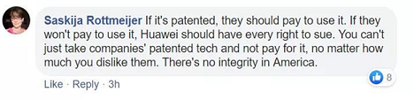 Un usuario de Facebook dijo: "Si está patentado, deberían pagar para usarlo. Si no pagan por usarlo, Huawei debería tener todo el derecho de demandar. No se puede simplemente utilizar la tecnología patentada de las empresas y no pagarla, no importa cuánto le disguste. No hay integridad en Estados Unidos".