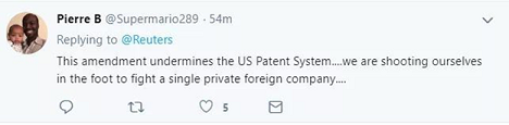 Un internauta dijo que el enfoque de Rubio sería similar a dispararle al país en el pie y da?aría la reputación del sistema de patentes de Estados Unidos. "Esta enmienda socava el sistema de patentes de EE.UU", dijo un usuario de Twitter en respuesta al informe de Reuters, y a?adió: "Nos estamos disparando en el pie para luchar contra una sola empresa privada extranjera".