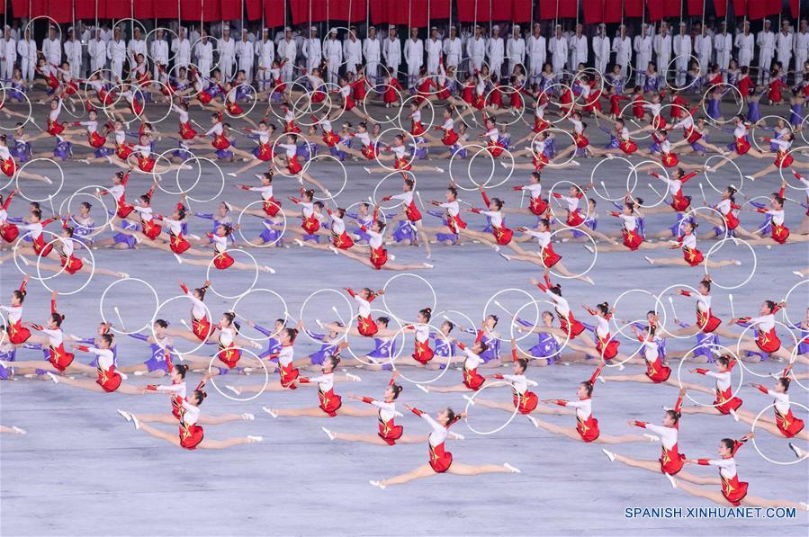 Un gran espectáculo de calistenia de masas y artístico se lleva a cabo en el Estadio Primero de Mayo en Pyongyang, República Popular Democrática de Corea (RPDC), el 20 de junio de 2019. Xi Jinping, secretario general del Comité Central del Partido Comunista de China (PCCh) y presidente chino, y su esposa, Peng Liyuan, acompa?ados por Kim Jong Un, presidente del Partido de los Trabajadores de Corea y presidente de la Comisión de Asuntos Estatales de la República Popular Democrática de Corea (RPDC), y su esposa, Ri Sol Ju, observaron el jueves el espectáculo. (Xinhua/Shen Hong)