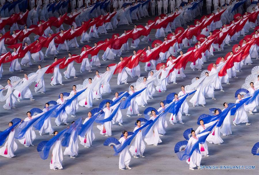 Un gran espectáculo de calistenia de masas y artístico se lleva a cabo en el Estadio Primero de Mayo en Pyongyang, República Popular Democrática de Corea (RPDC), el 20 de junio de 2019. Xi Jinping, secretario general del Comité Central del Partido Comunista de China (PCCh) y presidente chino, y su esposa, Peng Liyuan, acompa?ados por Kim Jong Un, presidente del Partido de los Trabajadores de Corea y presidente de la Comisión de Asuntos Estatales de la RPDC, y su esposa, Ri Sol Ju, observaron el jueves el espectáculo. (Xinhua/Shen Hong)