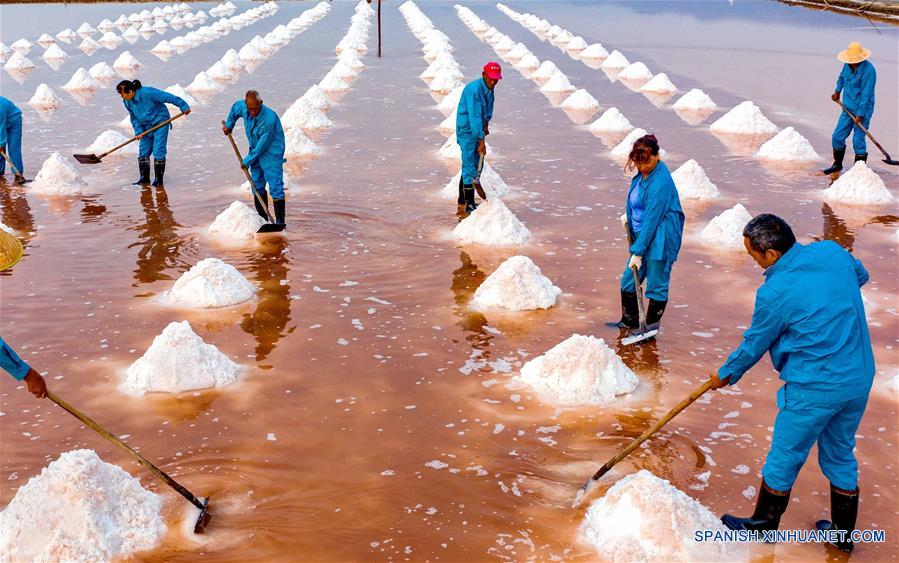 SHANXI, 24 junio, 2019 (Xinhua) -- Vista aérea del 23 de junio de 2019 de trabajadores salteando la sal cruda en el lago salado de Yuncheng, provincia de Shanxi, en el norte de China. El lago salado de Yuncheng, un famoso lago salado del interior de China, entró en temporada de cosecha de sal. (Xinhua/Wang Feihang)